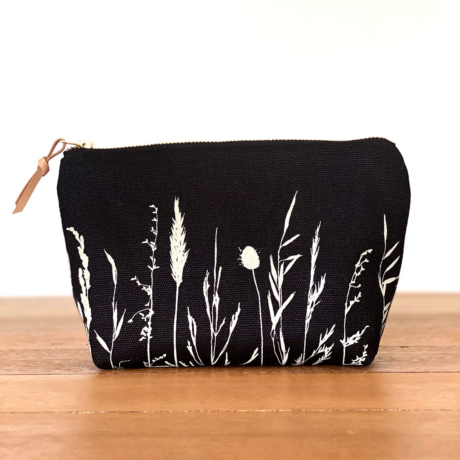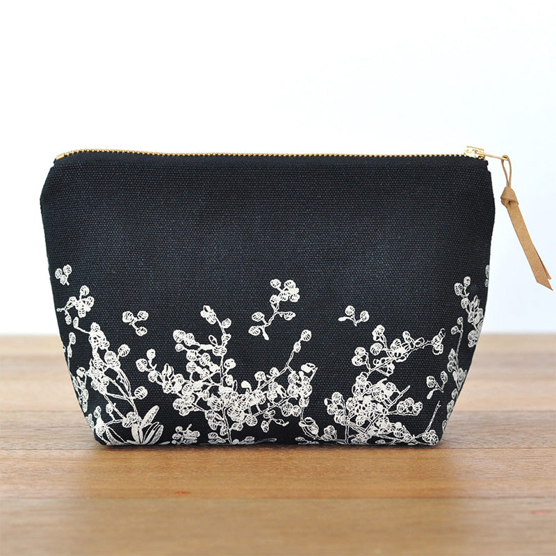 The pattern is hand drawn and screen printed with water based inks. The exterior fabric is heavy weight 55% hemp/45% organic cotton. The lining fabric is organic cotton. It features YKK brass zipper.
